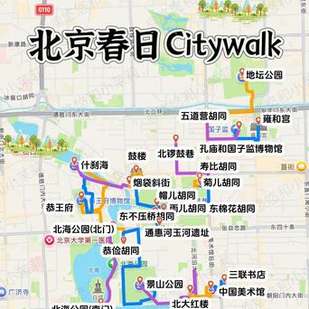 看花路线:北海公园(琼华岛丁香海棠,阐福寺丁香、连翘),恭俭胡同(泡桐花和古楸树,蔷薇花墙),景山公园(牡丹),北大红楼(玉兰),中国美术馆(紫白两种丁香)